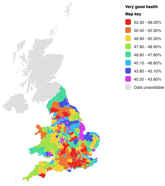 The census took place on the 21st March 2021, when the UK was in its third national lockdown. The impact of the Covid-19 pandemic in relation to both people’s actual health, and their perception of their own health is unknown. For those whose health was not impacted by the pandemic, or had potentially recovered from Covid by the time of the census, may have perceived their health as better than they did pre-pandemic, resulting in a higher proportion of people reporting “Very good” health. The overall impact of this is, at this moment, unknown, but worth keeping in mind when reviewing census health data.