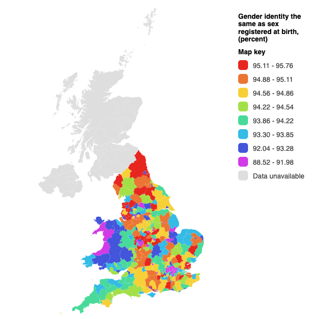 45.7 million people (94%) responded to the question. A total of 262,000 (0.5%) answered “No”, indicating that their gender identity was different from their sex registered at birth. Within this: