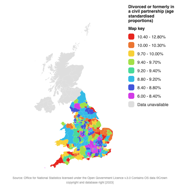 Norwich has the highest proportion of divorced adults at 12.8%, whilst Hackney has the highest proportion of people who are separated, but still legally married or still legally in a civil partnership (3.5%).