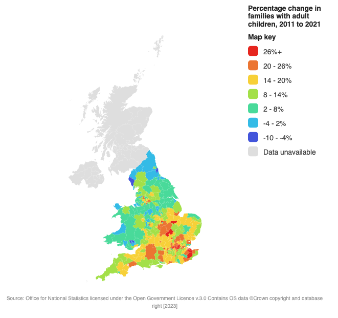The number of families in England and Wales with adult children living with their parents rose 13.6% between the 2011 Census and Census 2021 to nearly 3.8 million.