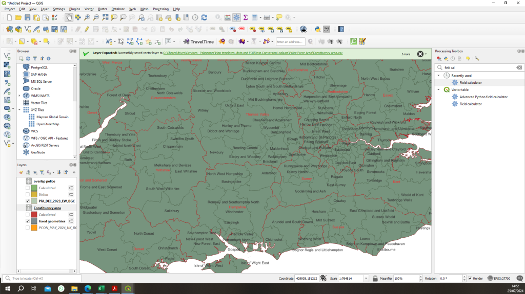 We use the GIS software to calculate the overlaps between shapefiles for police force areas and parliamentary constituencies.