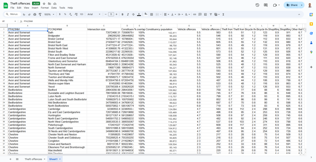 In a new tab, we paste a column of parliamentary constituencies and a second column of the police force areas they are mapped to. We have also included a column detailing the total population of each constituency.