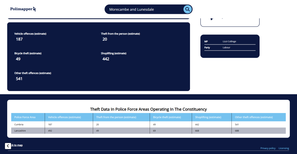 Our original spreadsheet includes details of all overlapping police force areas. Let’s take the most extreme example of Morecambe and Lunesdale where Cumbria accounts for just over half of the constituency, with the remainder the domain of Lancashire police.