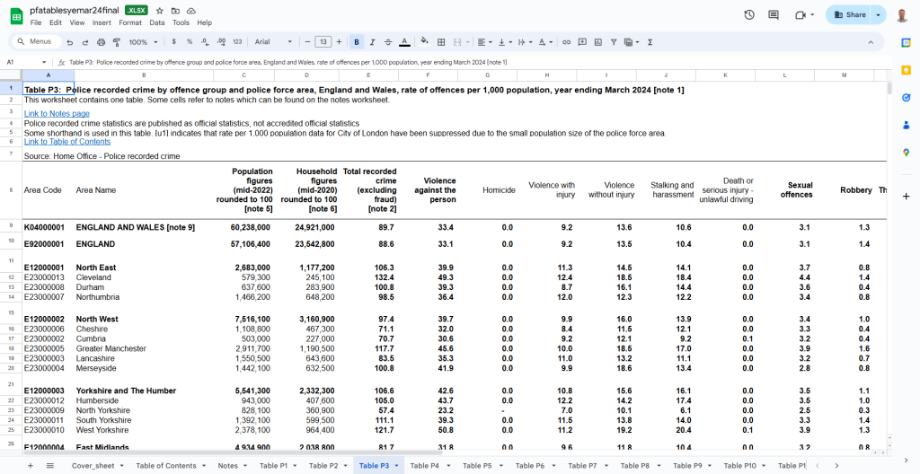Our next step is therefore to download the crime data we need per 1,000 population by Police Force Area. This comprises one tab of our Excel spreadsheet.