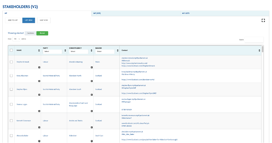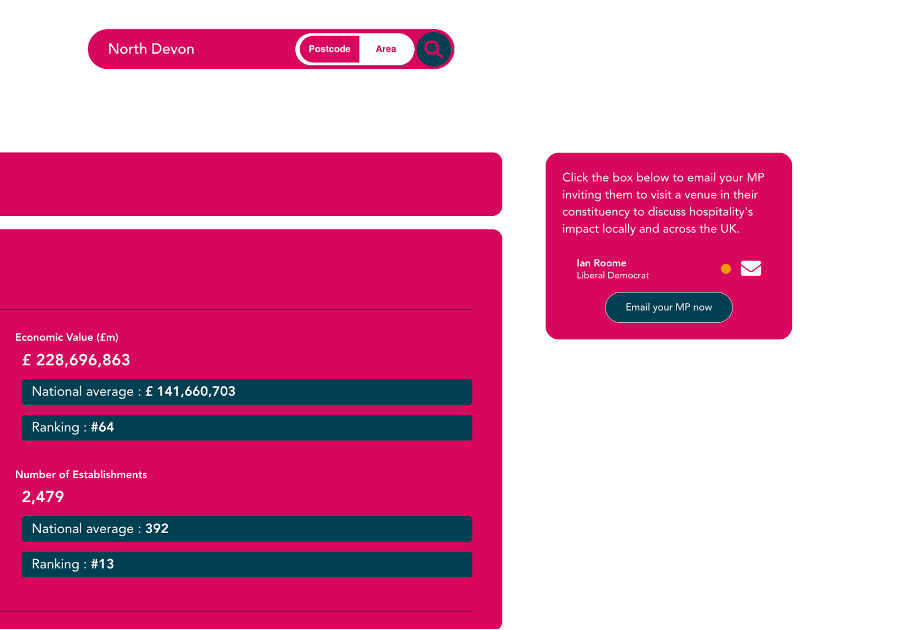 This is the ideal search function for when using the tool in 1-2-1 meetings with MPs or at events. Simply navigate to their constituency to present your dashboard of information for their area.