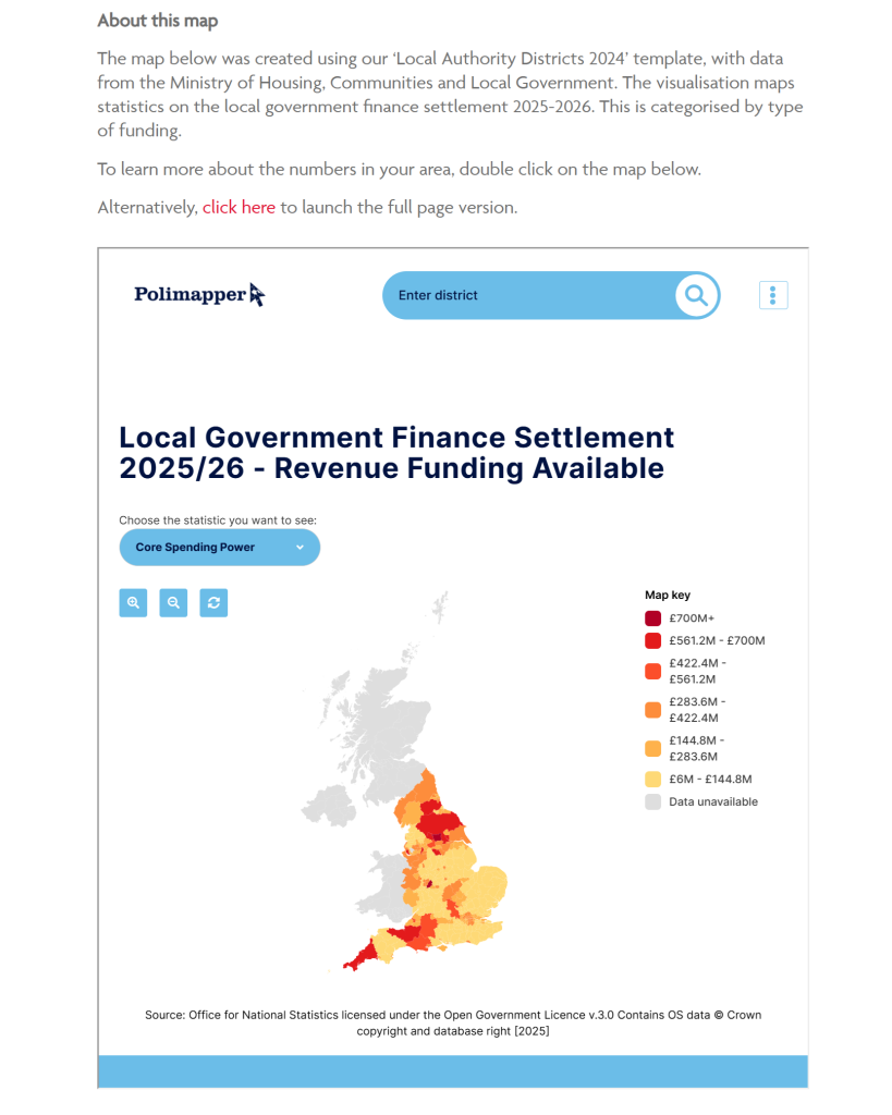 Below is a previous version of the iframe on our ‘Local Government Finance Settlement 2025/26’ Geodata Digest piece.