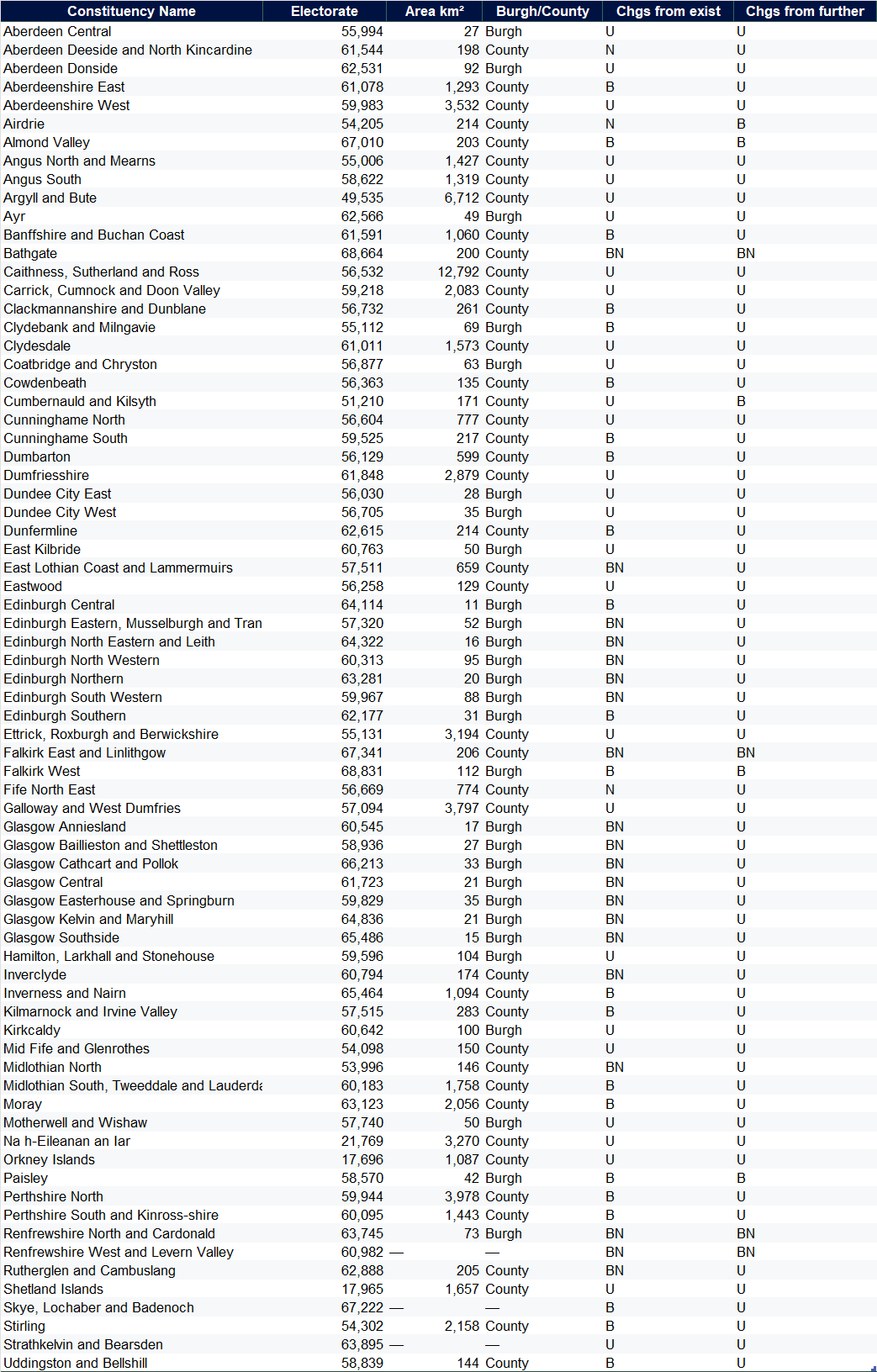 The overall impact of the changes means the range of electors per constituencies has been narrowed. While Argyll & Bute, the smallest constituency (outside of the three protected constituencies), still has 49,535 electors, the largest now has 68,871 (Almond Valley), down from 76,337 (Linlithgow).