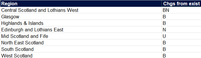 Mid Scotland and Fire is the only region to remain unchanged, while Highlands & Islands and North East Scotland see minimal changes to their boundaries.